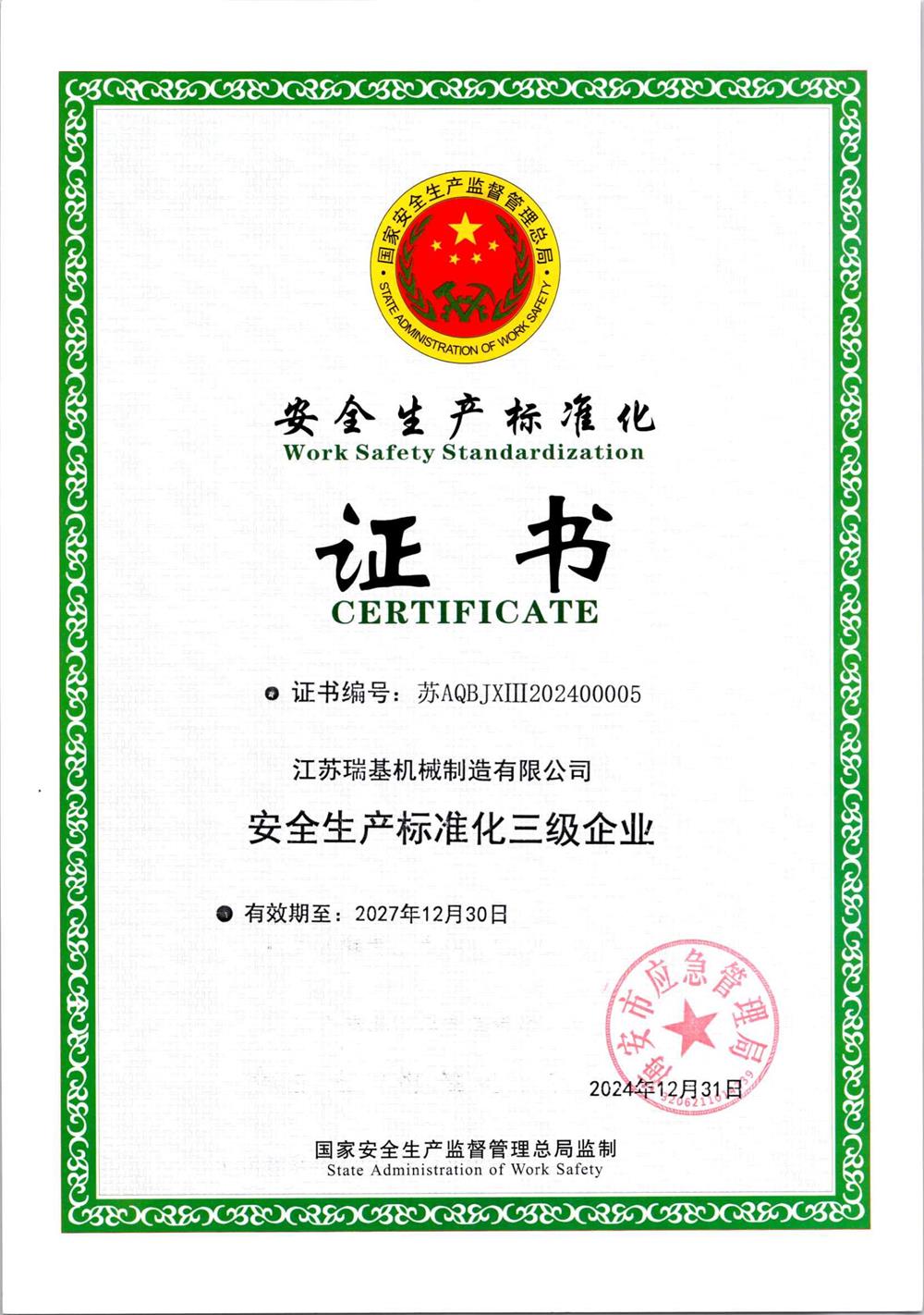安全生產標準化證書