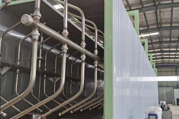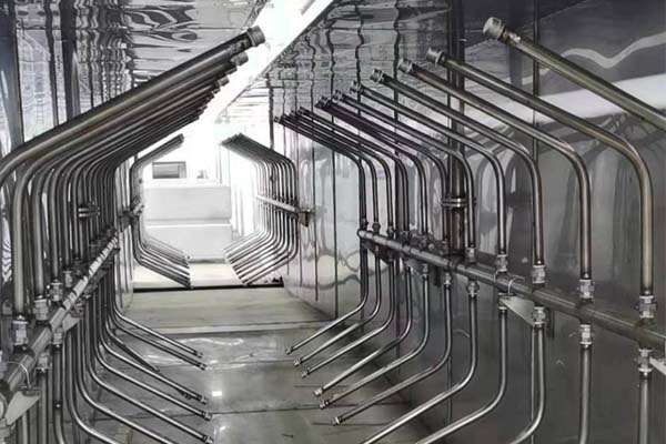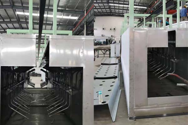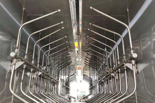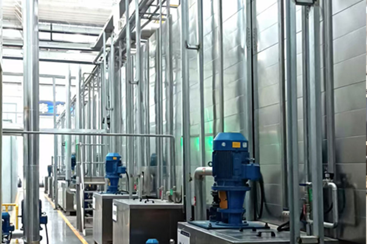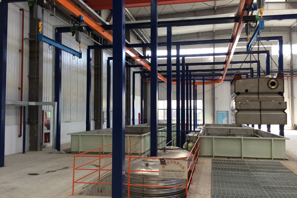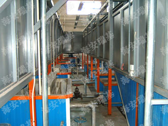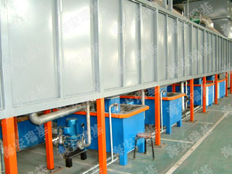 前處理生產(chǎn)線結(jié)構(gòu)特點是:前處理生產(chǎn)線各工序噴淋管布置在隧道內(nèi),噴淋由各液槽的泵來提供.各工序間都有門洞板隔開,以防竄液.各加熱液槽的加熱形式有槽內(nèi)和槽外。內(nèi)加熱器有排管、蛇形管、波紋板等;外加熱器有列管、板式加熱器等。加熱介質(zhì)有熱水 、蒸汽、導(dǎo)熱油等。在脫脂、磷化工序分別設(shè)有除油系統(tǒng)和除渣系統(tǒng)。為防止各加熱段隧道頂部及門洞處溢出蒸汽,在隧道頂部設(shè)有排風(fēng)機(jī)。